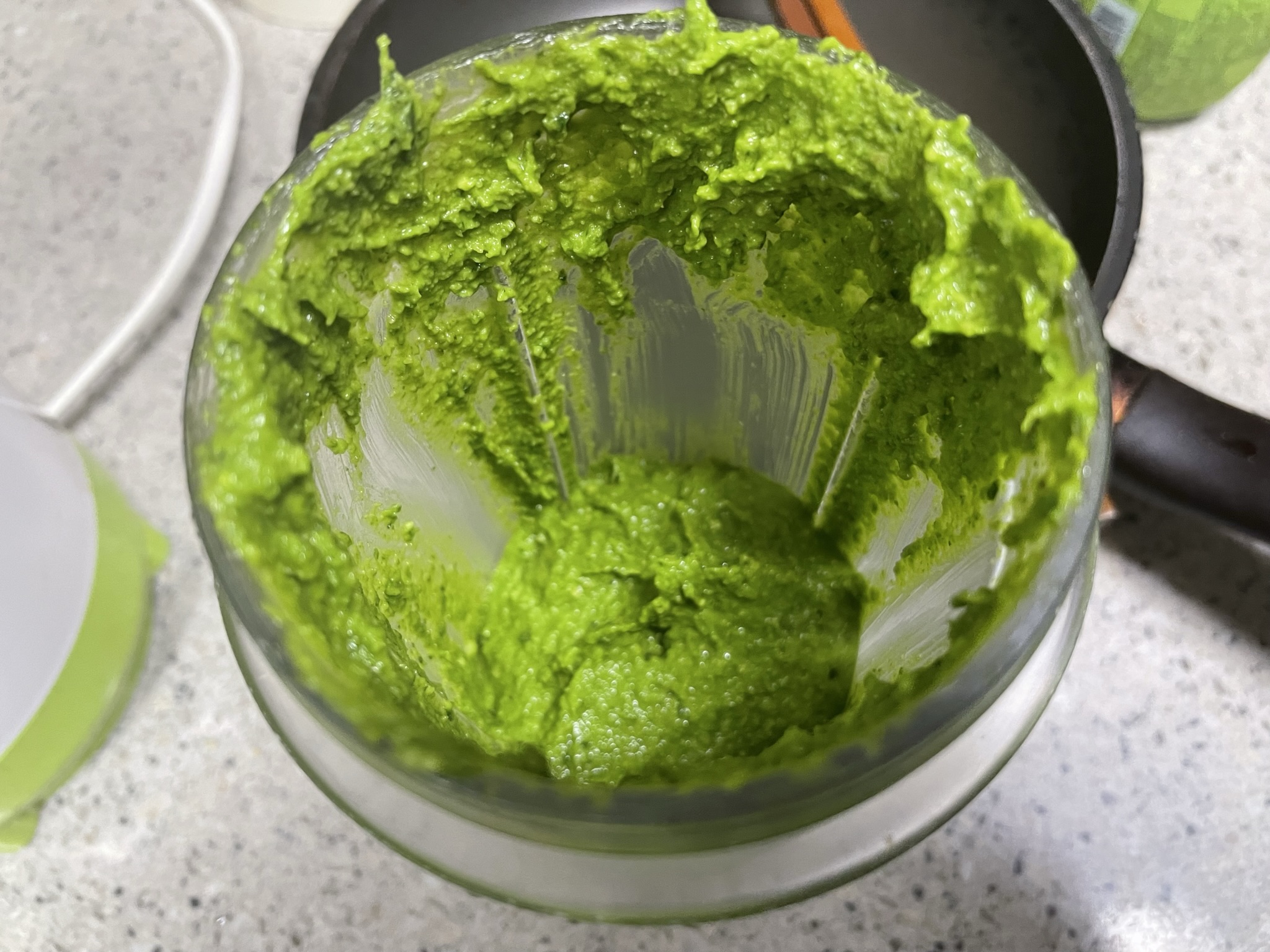 저렴이 바질 페스토예요. 재료는 바질 잔뜩에, 잣 대신 땅콩, 그라나 파나다 치즈 대신 건조 파마산 치즈, 엑스트라 버진 올리브, 마늘...