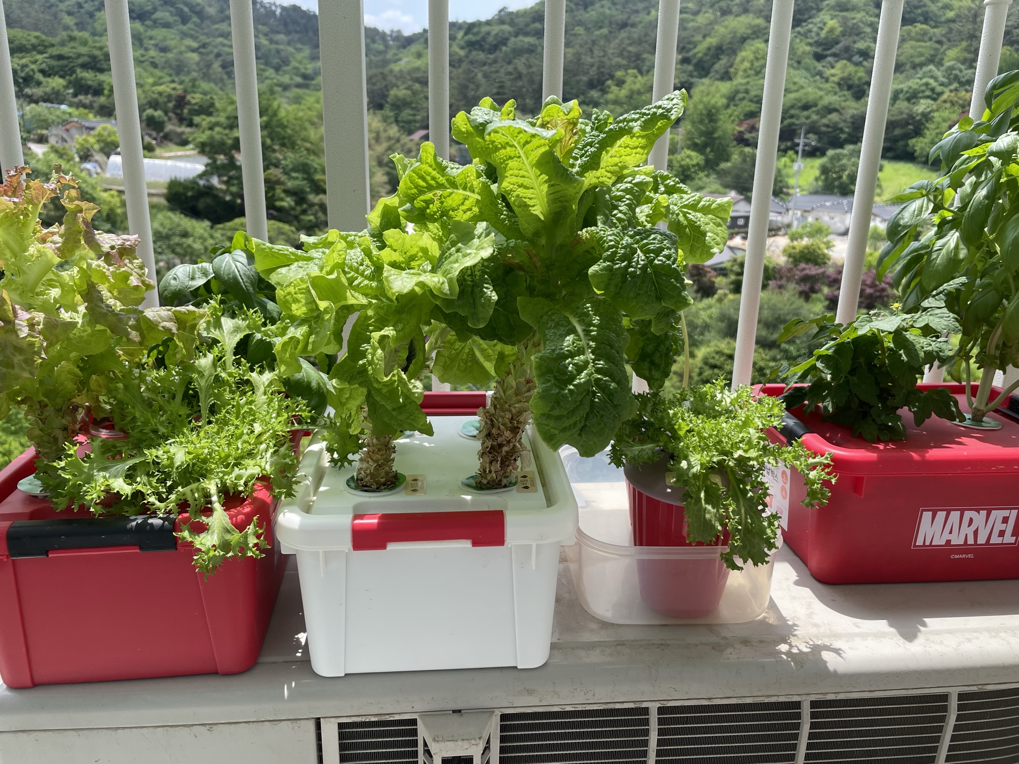 날이 좋아서 실외기 위에 올려놓은 마블 수납함 채소들이 잘 자라네요.