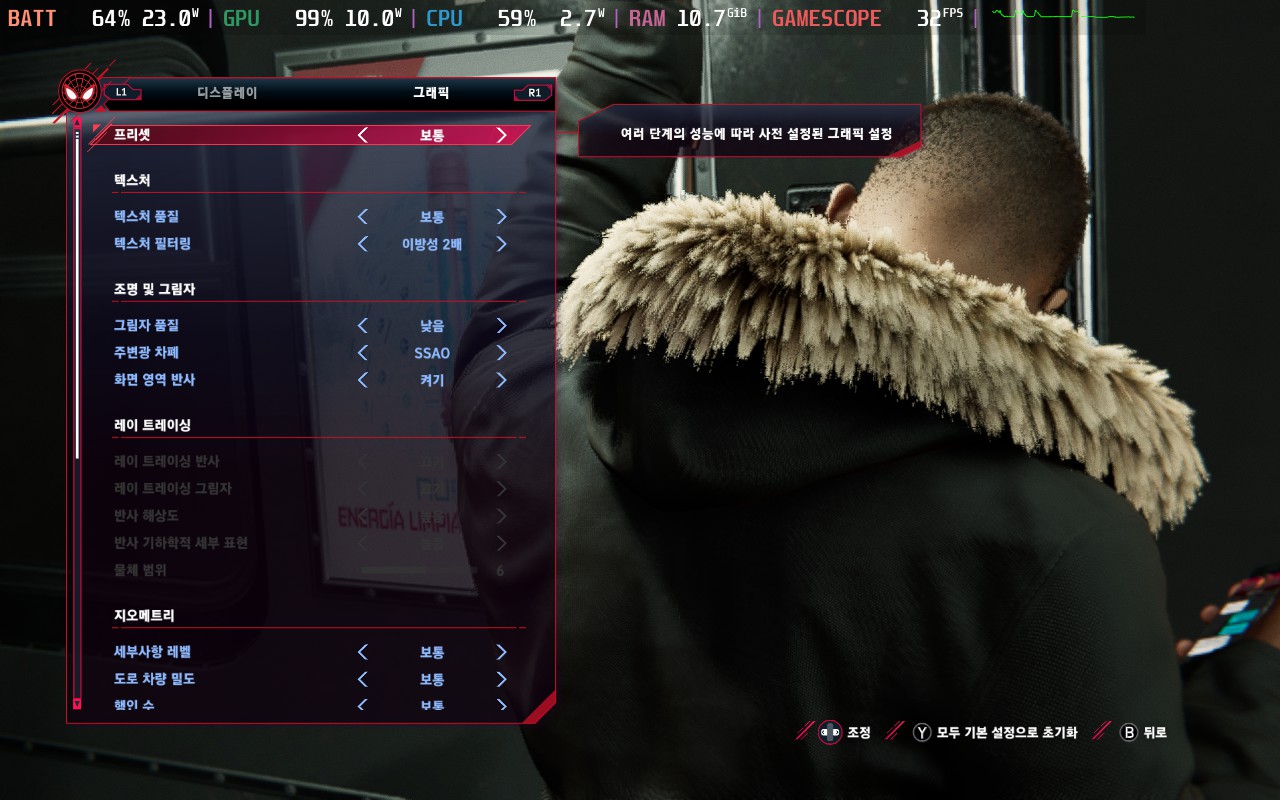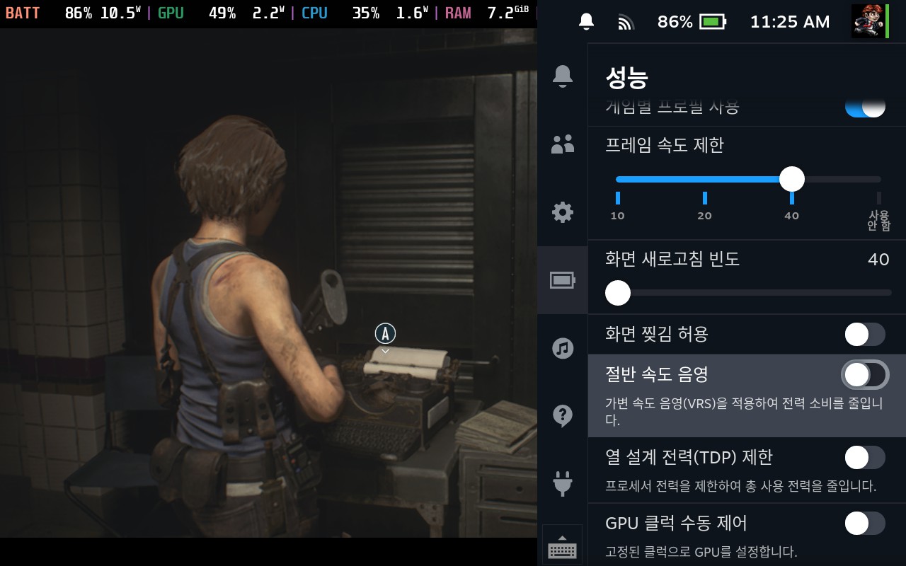 설정은 프레임 속도 제한 40. 새로고침 빈도 40으로 하고, 10 Watt 정도로 쾌적하게 플레이 가능합니다.